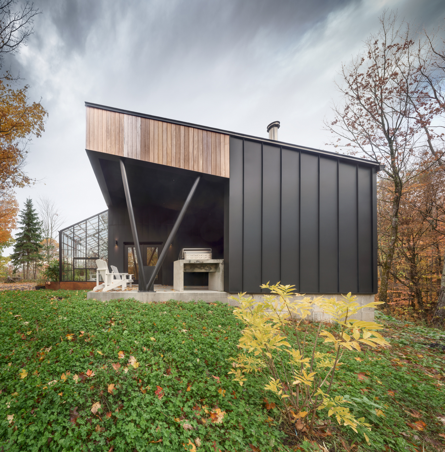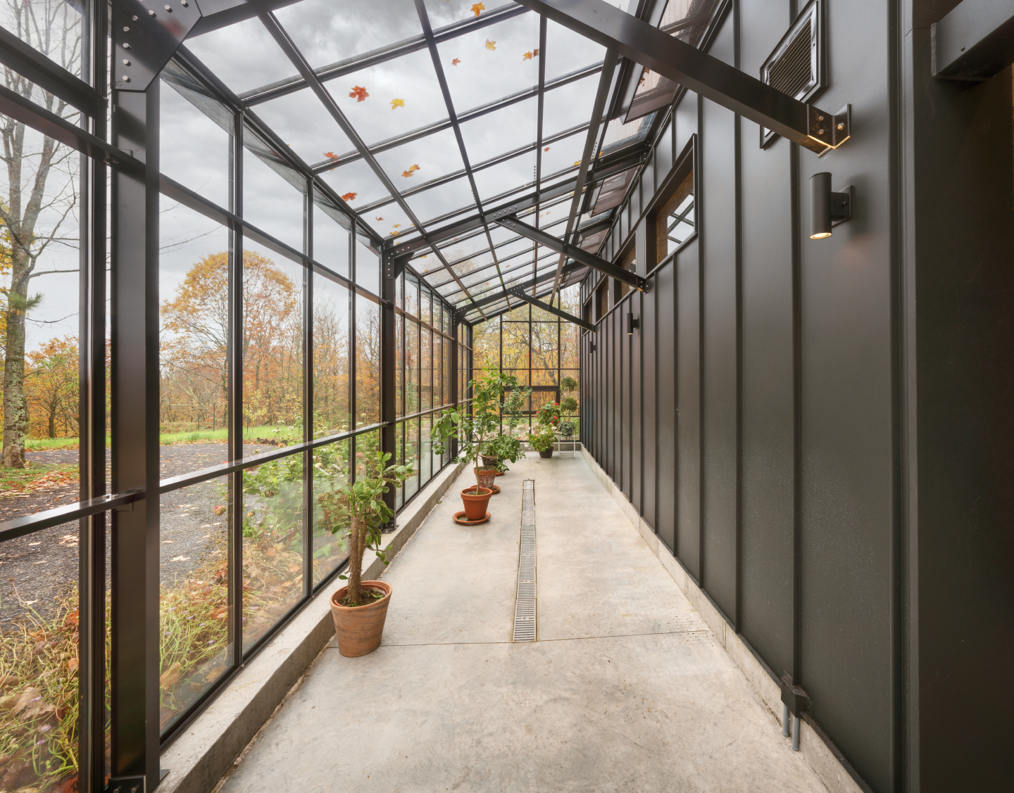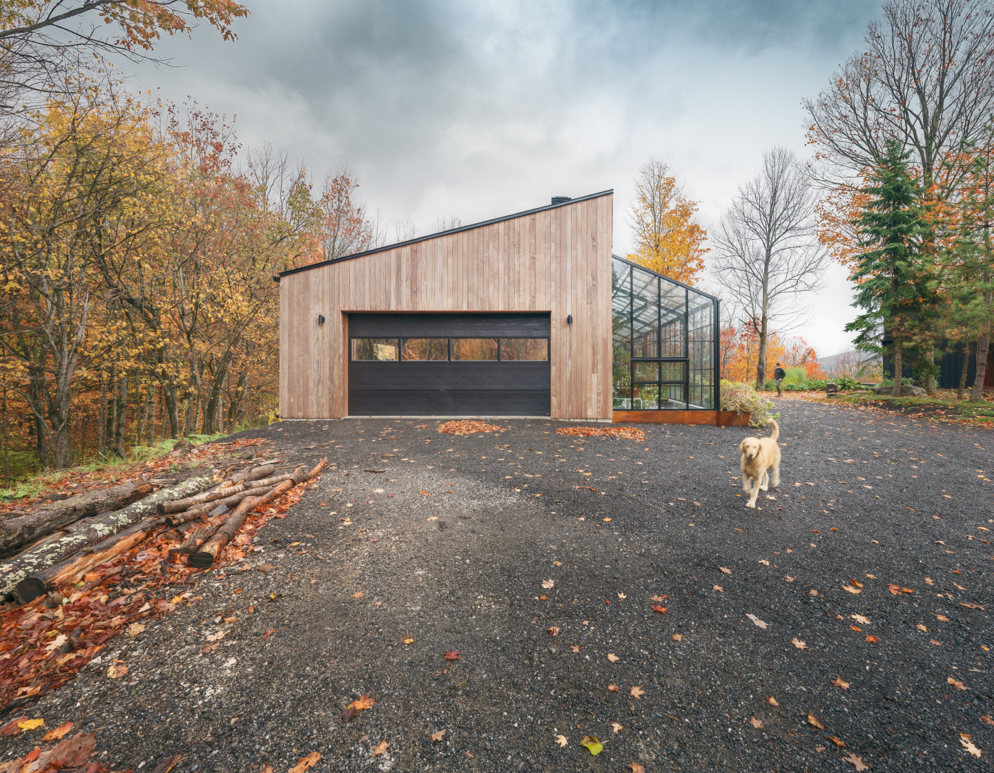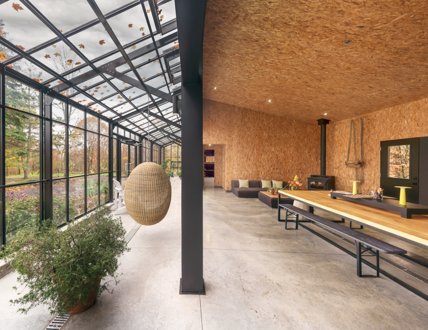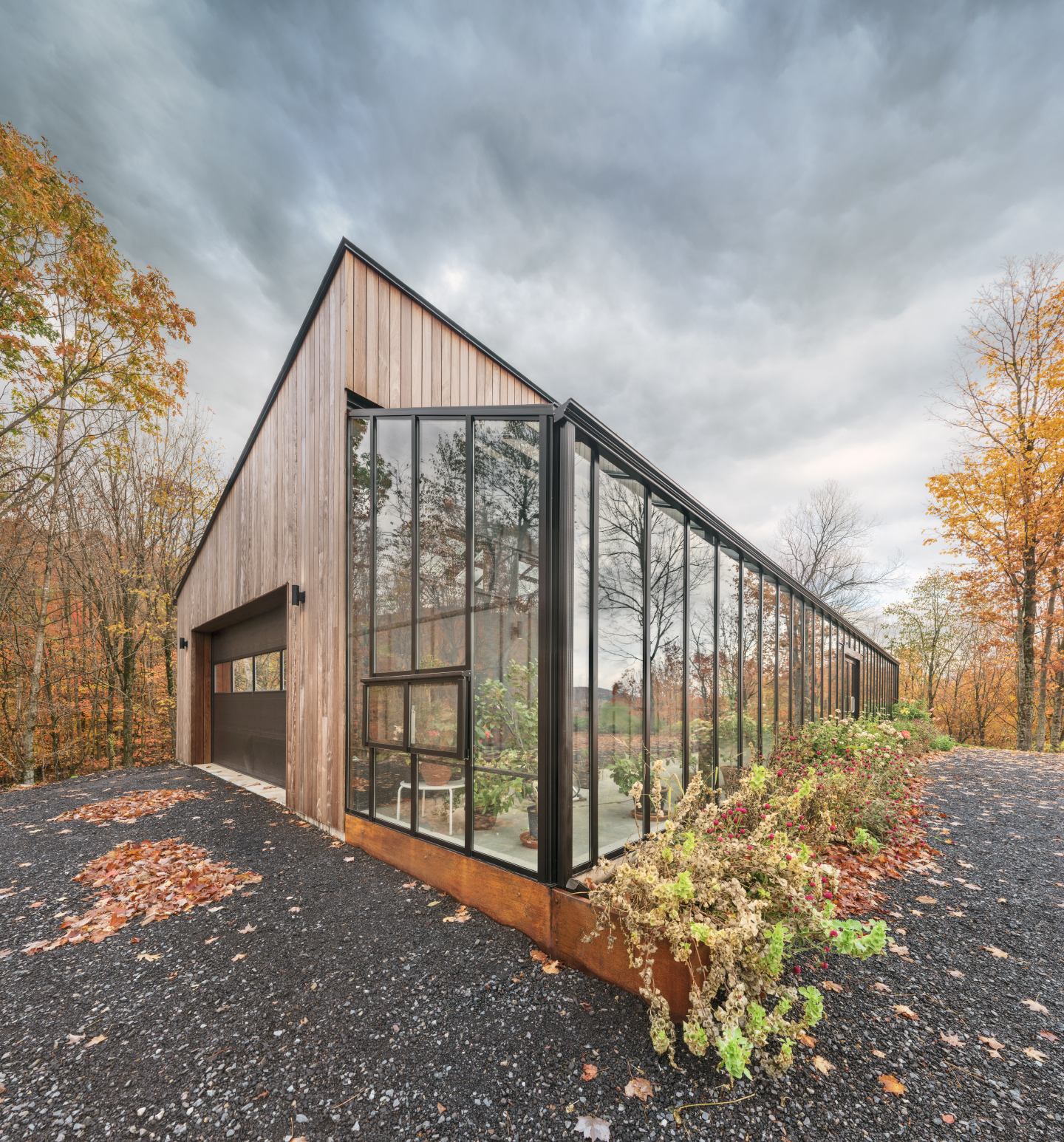 Le volume en bois regroupe le garage et les fonctions plus techniques, tandis que la serre s’étire en façade comme une galerie transparente où le jardin se prolonge à l’intérieur. La structure métallique fine, le verre et le parement de bois composent un ensemble léger qui dialogue avec la nature et capte les variations de lumière au fil des saisons.