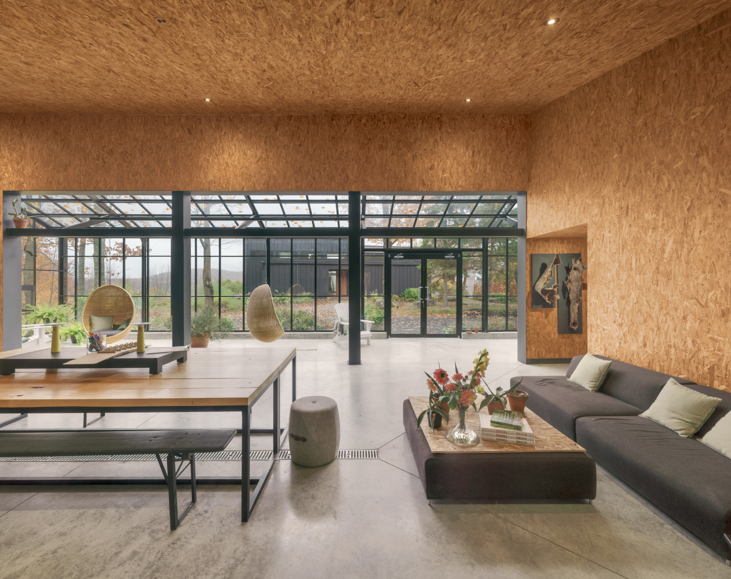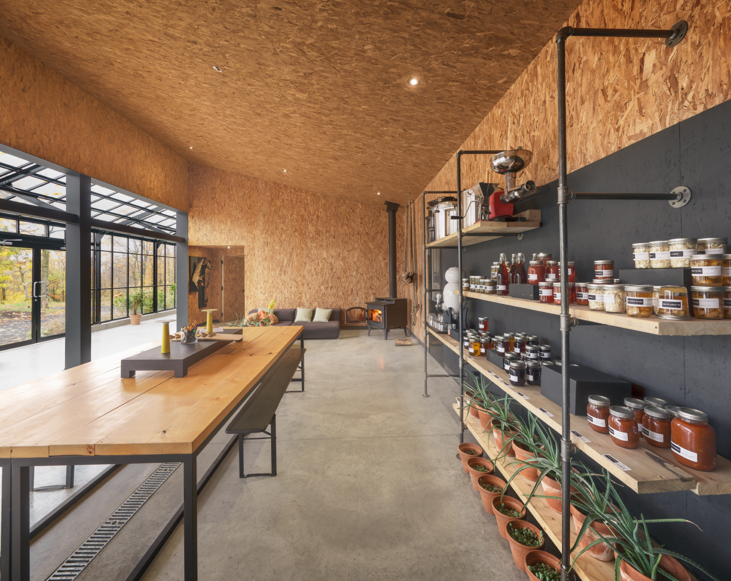 À l’intérieur, un grand espace ouvert aux finitions franches, dalle de béton continue et parois en panneaux de bois, offre un cadre robuste et chaleureux pour les longues tables, le coin salon et les étagères remplies de conserves et de préparations maison. Le poêle à bois et les suspensions tressées ajoutent une dimension domestique à cet environnement de travail, brouillant volontairement la frontière entre ferme, atelier et maison.