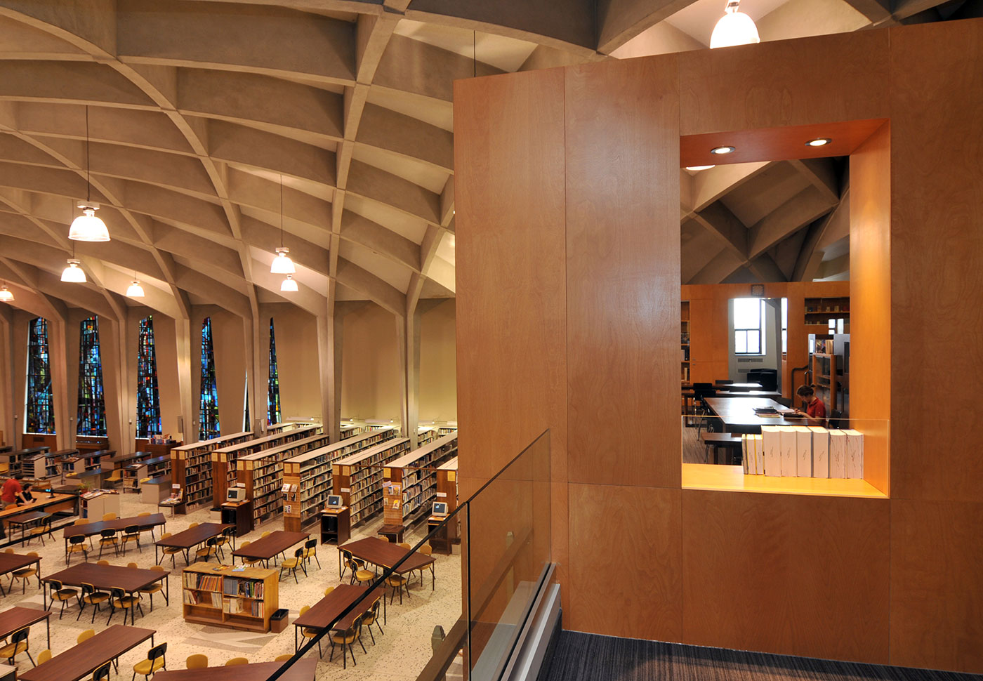 Institution incontournable du centre-ville de Sherbrooke établie en 1875, le Séminaire de Sherbrooke a procédé en 2007 au réaménagement du jubé de la grande chapelle. La mezzanine de cette section construite en 1962 constitue un patrimoine moderne reconnu des Cantons-de-l’Est, par la structure en voûte lamellée et sa dizaine de vitraux colorés. Initié en partenariat avec la Fondation du Séminaire de Sherbrooke, le réaménagement a mis en valeur l’imposante collection de livres rares de l’institution afin d’intégrer simultanément l’attrait à la consultation de ses documents, la qualité visuelle des lieux et l’énoncé de la mission première des lieux destinés aux ordres secondaire et collégial. Le réaménagement voulait permettre l’accès et l’intégration de nouvelles aires de travail et de consultation pour les étudiants et la remise aux normes des issues, sans toutefois compromettre le fonctionnement de la bibliothèque. L’enjeu du projet visait tout d’abord à réactualiser ce vaste espace laissé à lui-même et de le qualifier afin de lui redonner un lustre de façon intrinsèque. Le réaménagement du Carrefour de l’Information se veut une extension logique du lieu qui lui donne racine. Un lieu de dualité: la vitalité et le dynamisme de l’intervention contemporaine ont fait renaître ce joyau, pour créer une ambiance stimulante, posée et confortable, tout en gardant l’endroit comme un lieu de recueillement et d’introspection.