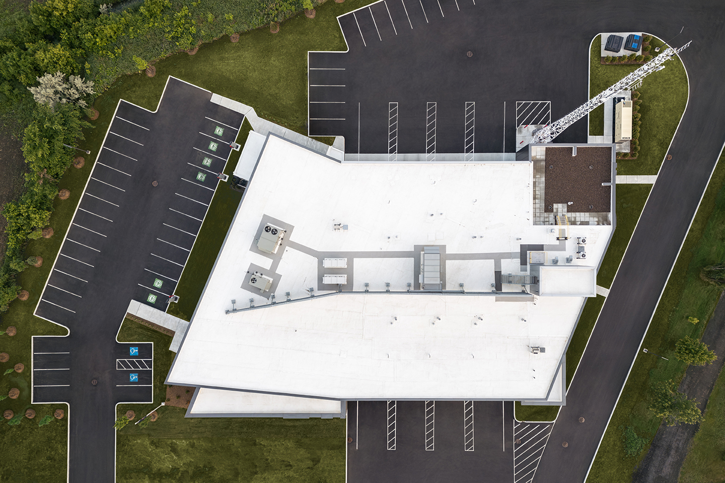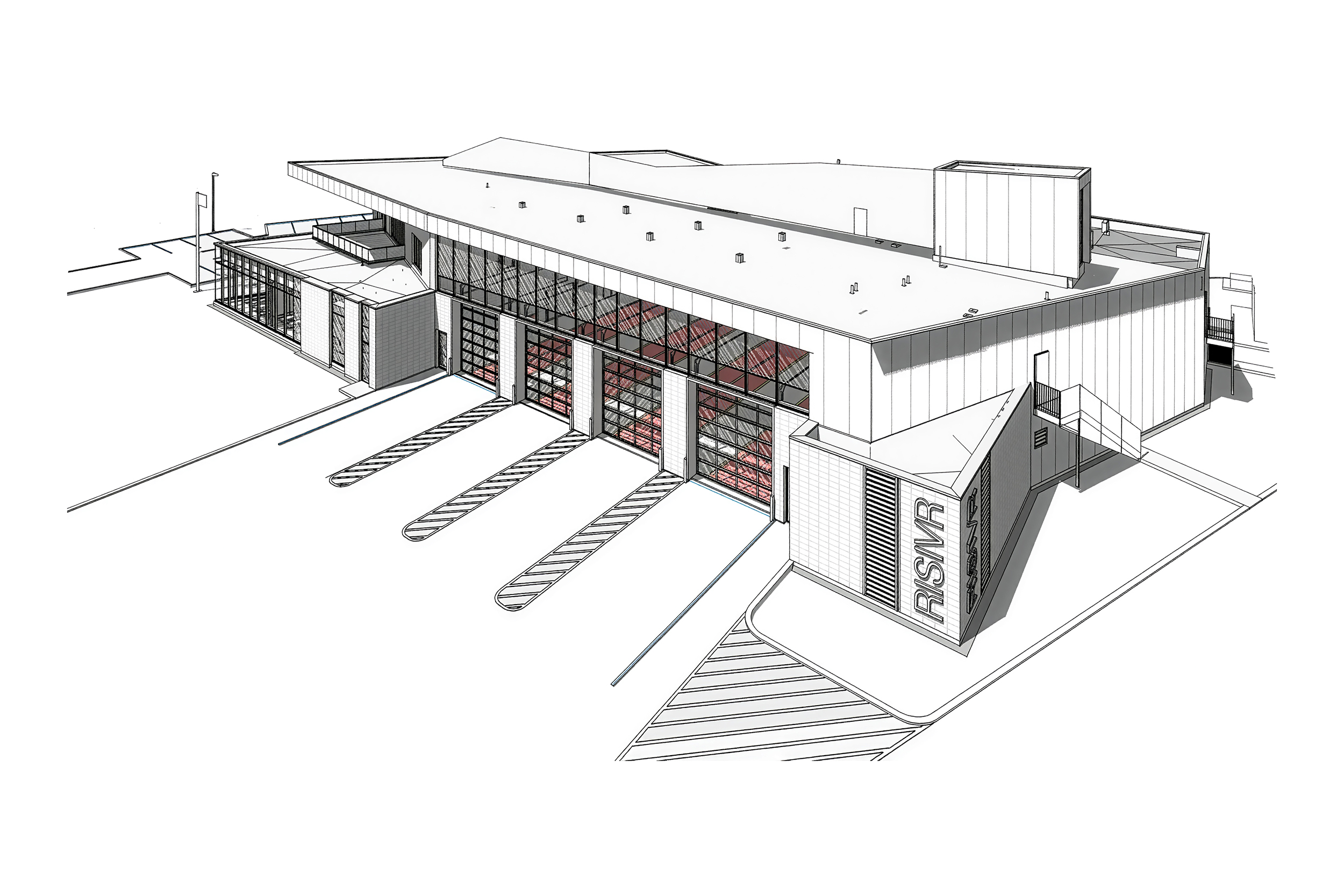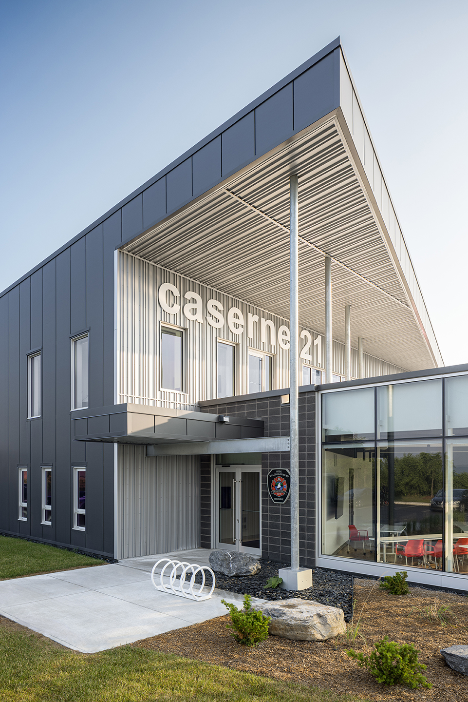 Le bâtiment s’inspire des basses terres du Saint‑Laurent et des silhouettes des collines montérégiennes voisines. Sa forme basse et minérale semble émerger de la plaine, comme un affleurement de roche mis à nu par le passage des glaciers, et traduit le rôle de la caserne comme un roc protecteur veillant sereinement sur le territoire. Vu du dessus, le plan en éventail rend lisibles les différentes strates du projet : secteur opérationnel, espaces de vie, administration et zones de formation se déploient autour des parcours d’intervention.