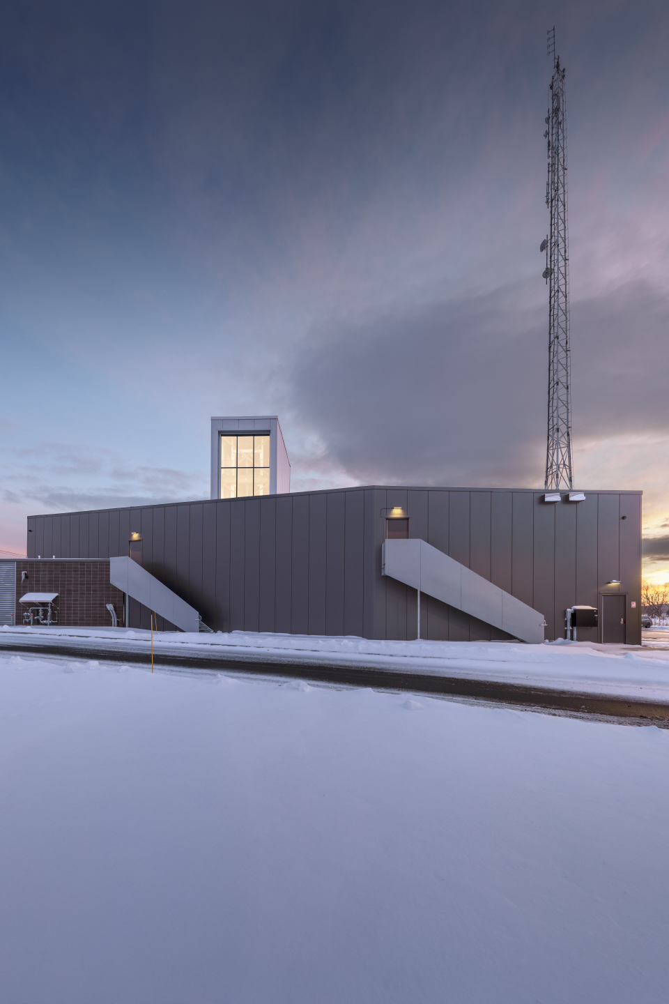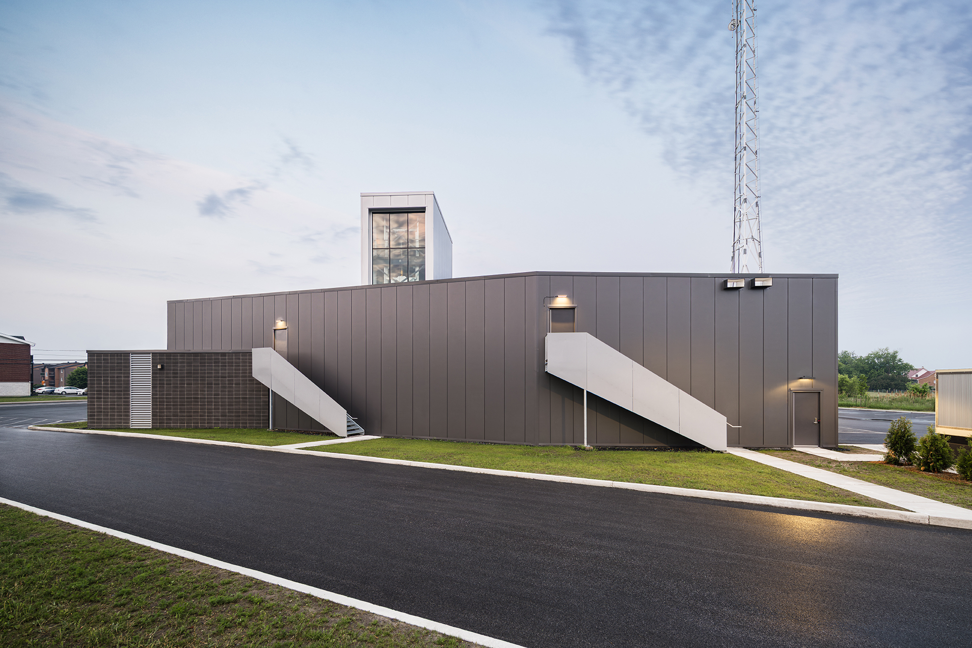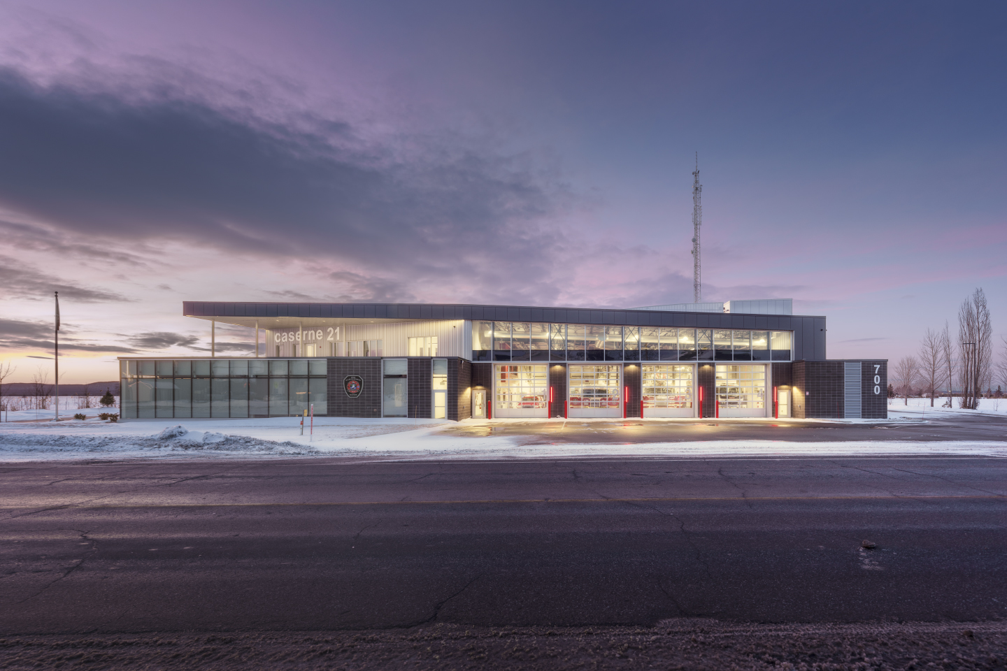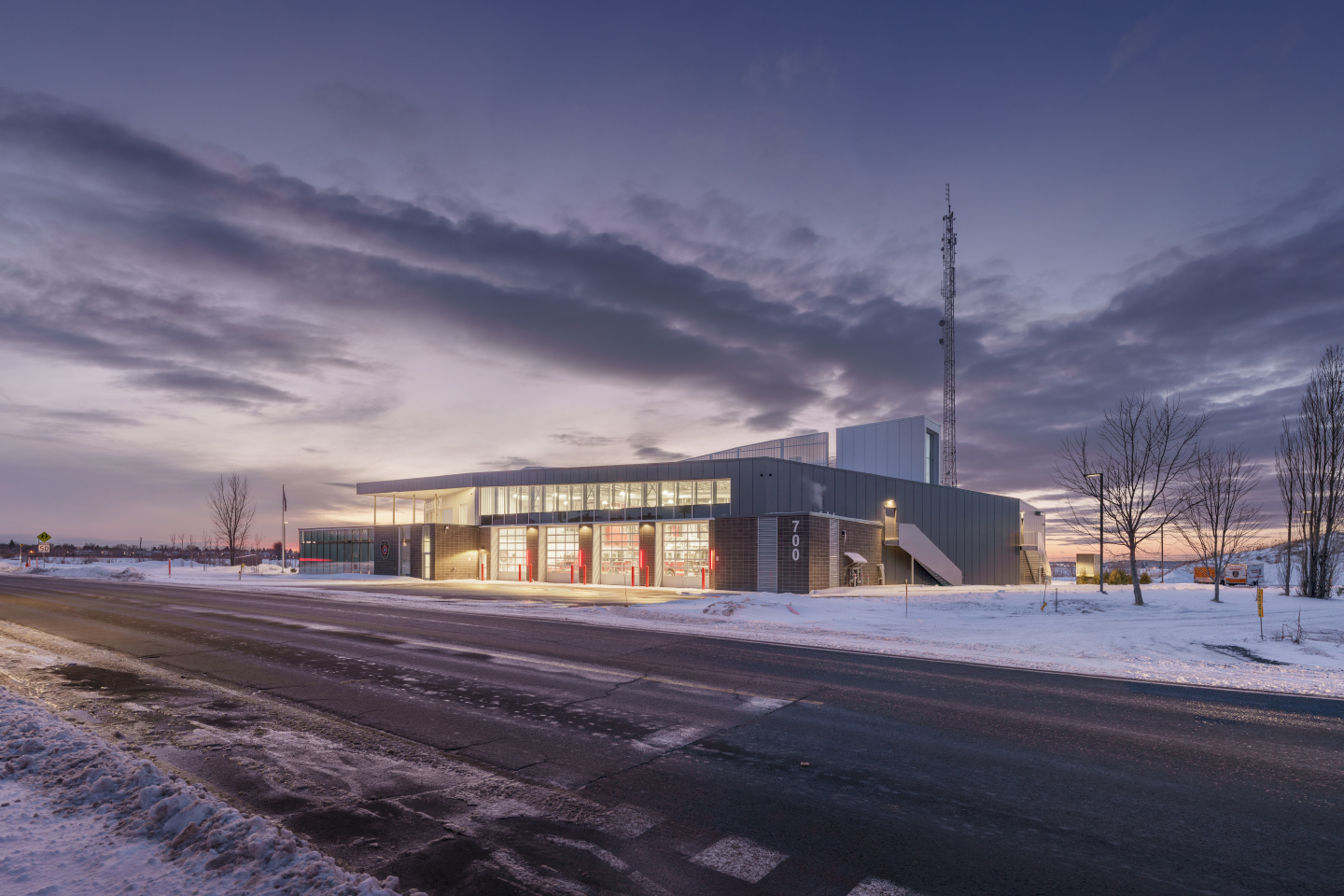 L’implantation sur un ancien dépôt à neige a guidé la conception : terrain irrégulier, sol de capacité limitée et contamination résiduelle ont conduit à un bâtiment posé sur pieux, qui épouse les lignes du lot et organise clairement les accès. Les aménagements extérieurs intègrent les aires d’entraînement pour la désincarcération et les conteneurs de simulation d’embrasement, de sorte que la caserne fonctionne à la fois comme poste d’intervention, lieu d’apprentissage et repère linéaire à l’entrée nord de Beloeil.