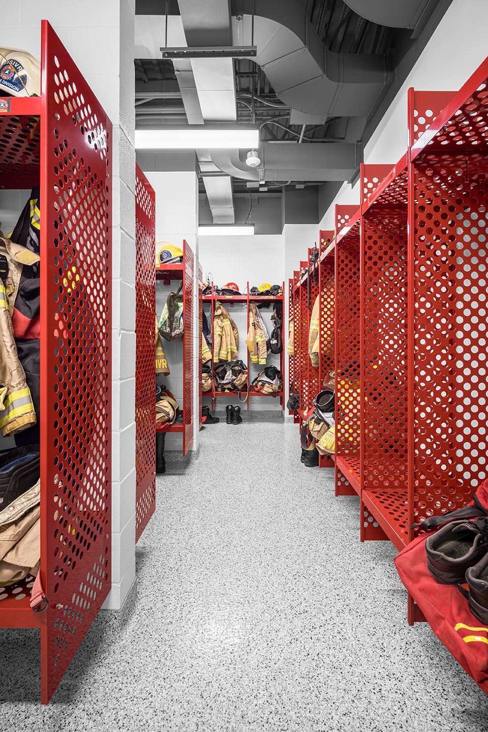Sur deux niveaux, la caserne réunit l’aire des véhicules d’urgence, les espaces de décontamination et de rangement, ainsi que les lieux de vie pour les pompiers : chambres individuelles, grande cuisine, salle commune, gymnase. À l’étage, les bureaux de la Régie et les salles de réunion et de formation complètent l’ensemble et rapprochent administration et équipes de terrain. La lumière naturelle, les vues cadrées sur le site d’entraînement et la matérialité robuste donnent à ces espaces un caractère calme et durable, en accord avec la nature du métier.