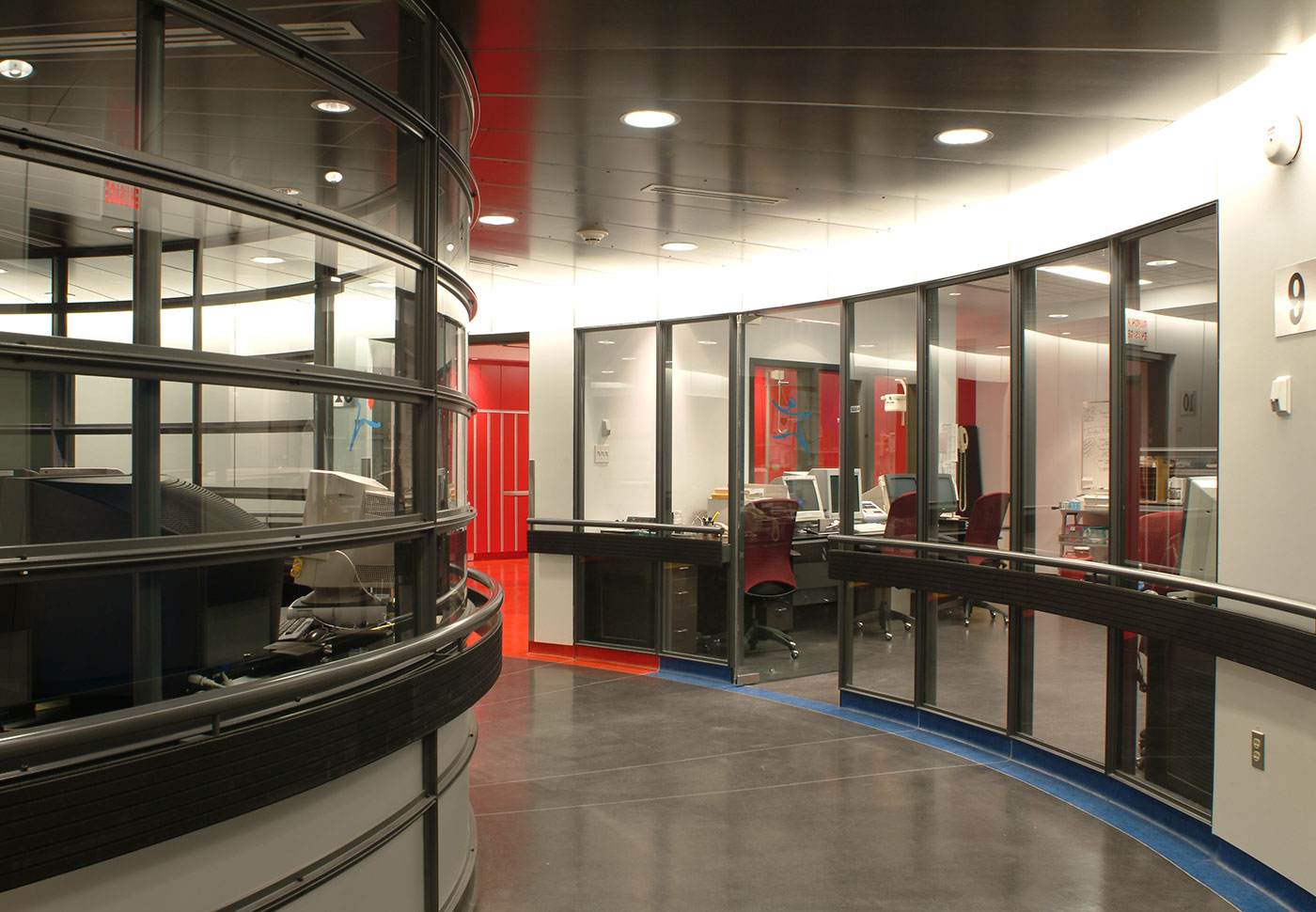 Le réaménagement d’une partie existante du département de radiologie du CHUS a permis l’installation de trois nouveaux appareils dans des salles modernes et adaptées aux nouvelles percées dans ce domaine. Situé au bout de deux corridors en impasse, le service prend la forme d’un demi-cercle, les salles d’intervention et de contrôle étant distribuées autour d’une salle de lecture centrale. Le design intérieur répond à la demande du client de faire du service une vitrine technologique fonctionnelle et attrayante. Afin de distinguer les salles et de produire un environnement original, un jeu avec les trois couleurs primaires est devenu un thème récurrent qui donne de la cohérence au concept global. De plus, l’aménagement radial impose à toutes les composantes et les finis de s’organiser selon un rayon du cercle dans lequel le service est inscrit. L’utilisation de matériaux modernes comme le verre courbé et l’acier, des détails raffinés et un éclairage recherché mettent en scène de façon futuriste les appareils d’imagerie sophistiqués.