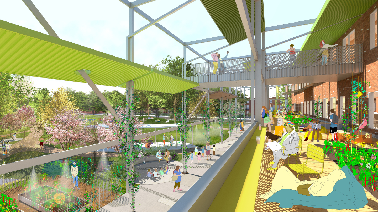 Projet finaliste développé dans le cadre d’un concours d’architecture pour le quartier Villeray, cette proposition pour la bibliothèque Caroline-Dawson et le parc Le Prévost fait partie des quatre projets retenus pour la troisième et dernière étape du processus.