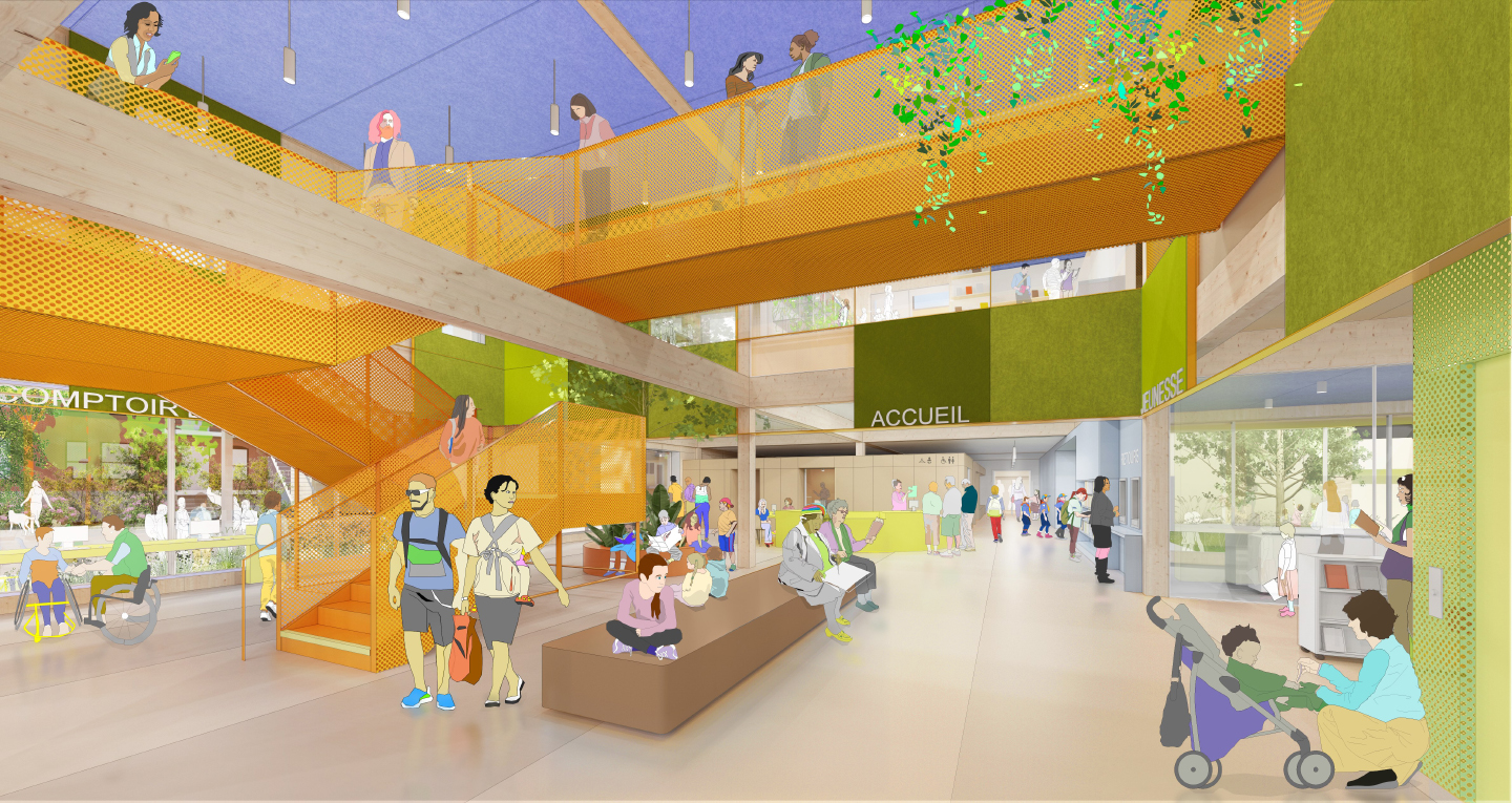 La bibliothèque est pensée comme un tiers lieu accueillant, confortable et accessible, un « second chez-soi » pour tous les publics, quels que soient l’âge, le genre ou l’origine. Les matériaux chaleureux — structure et murs en bois massif, panneaux acoustiques dans une palette de verts et de jaunes, sols en béton et linoléum — dialoguent avec un mobilier coloré pour créer des ambiances calmes, lumineuses et acoustiquement maîtrisées.