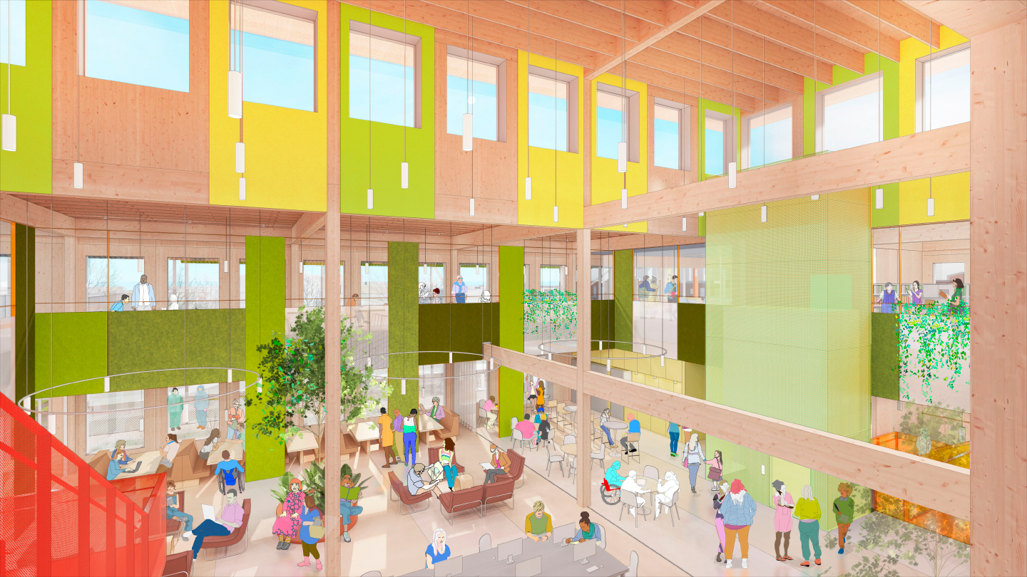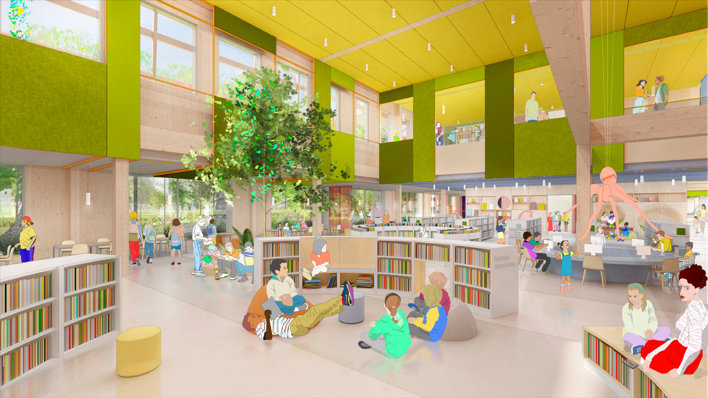 À l’intérieur, de vastes atriums en double hauteur structurent les parcours et baignent les espaces de lumière naturelle. Les esplanades des jeunes, des adolescents et des adultes se déploient sur plusieurs niveaux autour de ces jardins intérieurs, offrant une diversité de lieux pour lire, travailler, jouer, se rencontrer ou simplement se poser.
