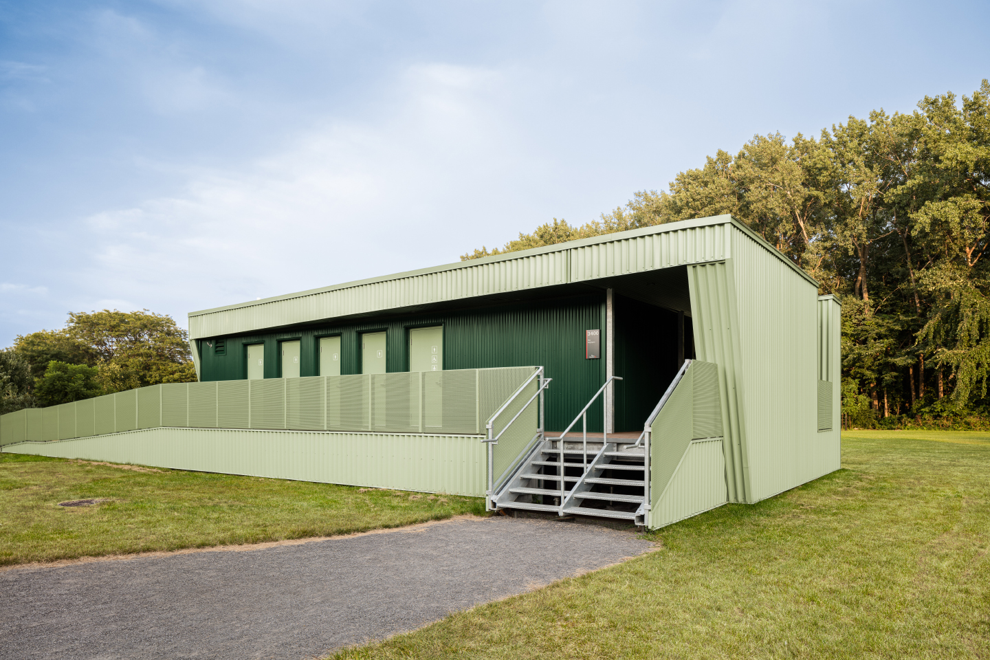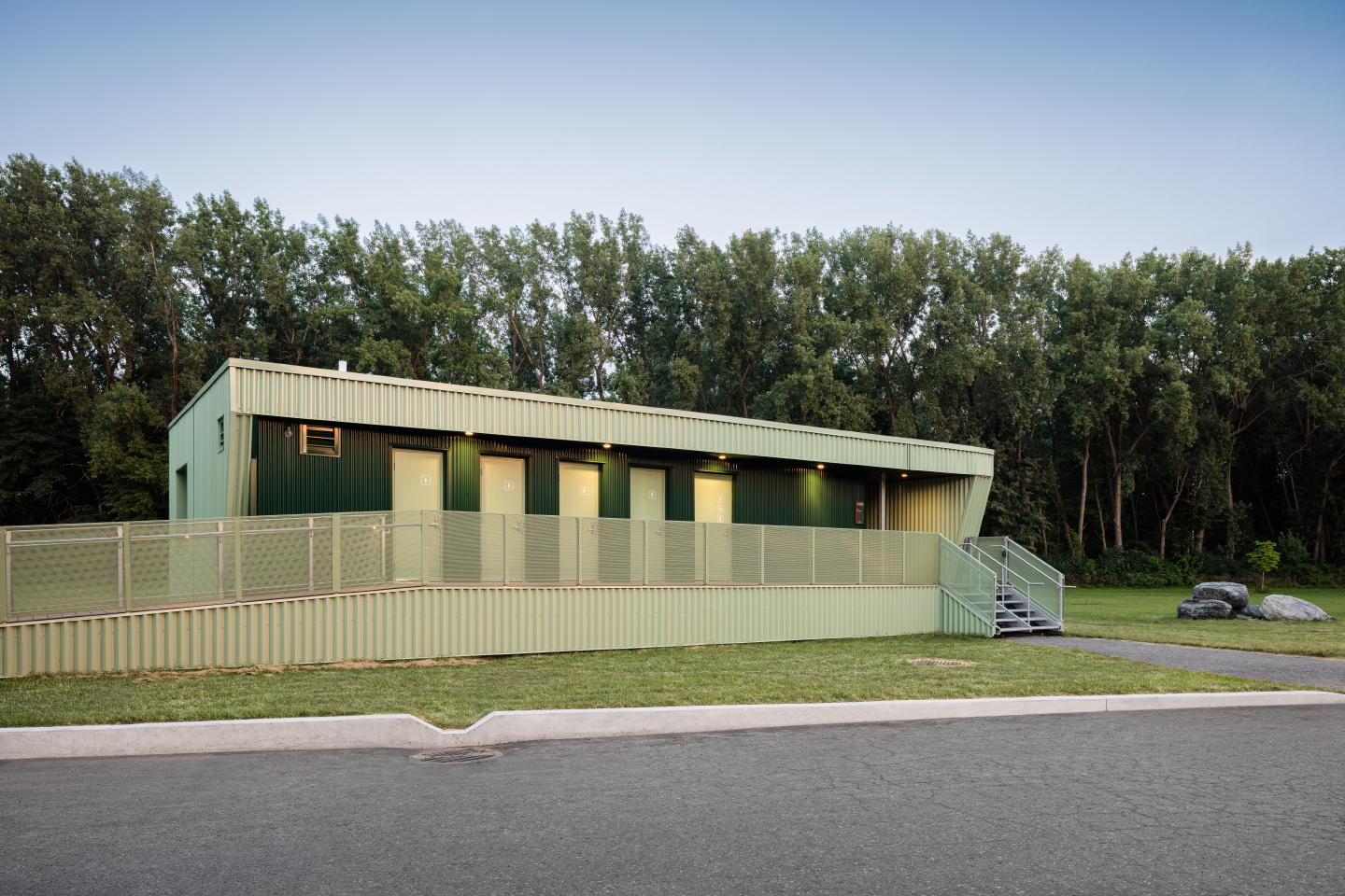 Le programme regroupe six toilettes, dont deux accessibles aux personnes à mobilité réduite, ainsi qu’un local communautaire pouvant servir de refuge pour les skieurs en hiver. Inspiré du langage brutaliste du bâtiment des quartiers d’hiver, le volume compact dialogue avec la végétation environnante et s’insère avec sobriété dans le paysage. La proximité des réseaux souterrains existants a guidé l’implantation, de façon à minimiser les interventions sur les infrastructures et à faciliter une éventuelle délocalisation.