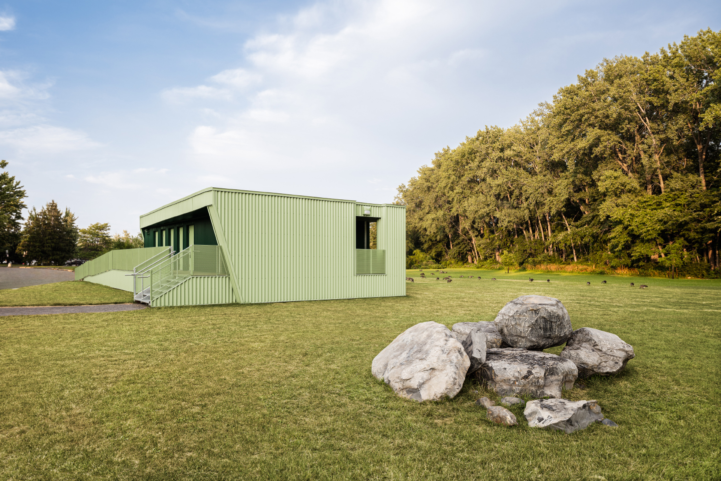 Implanté de manière à limiter son empreinte sur le site, le pavillon repose sur deux modules préfabriqués de 12 par 42 pieds, fabriqués en usine puis assemblés sur place. Cette stratégie modulaire permet d’envisager à terme le déplacement et la réutilisation du bâtiment, tout en garantissant une qualité de construction contrôlée. Les travaux ont été réalisés en deux phases, distinguant les interventions de génie civil et d’infrastructures de l’installation des modules, afin de réduire l’impact sur le sol et de respecter les périodes de sensibilité de la faune, particulièrement les oiseaux migrateurs qui fréquentent le parc.