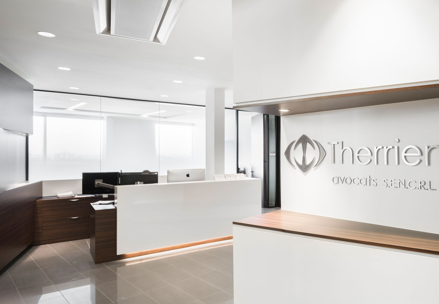 Therrien Couture Jolicoeur est une importante firme d’avocats de niveau régional offrant ses services-conseils aux entreprises et aux particuliers. Le désir d’implanter ses bureaux dans diverses régions du Québec a motivé la firme à ouvrir de nouveaux bureaux à Sherbrooke en 2013, puis à Laval en 2016. Pour le bureau de Sherbrooke, les aires ouvertes sont aménagées au périmètre du bâtiment pour amener un maximum d’éclairage naturel à l’ensemble des employés et pour favoriser la synergie d’équipe. Les bureaux fermés de grandeur homogène sont regroupés au centre avec les espaces de services communs. Pour assurer la confidentialité entre les bureaux d’avocats et la zone commune plus conviviale de la réception et du centre de conférences, un mur courbe en bois et en verre délimite le secteur privé du secteur public. Le nouvel établissement d’affaires de Laval marque une étape pour Therrien Couture qui s’établit au cœur d’un quartier en développement tout en se rapprochant de la métropole. Celui-ci reprend les principes établis à Sherbrooke, mais le concept s’inspire cette fois-ci de la densité urbaine. Ainsi, les différentes fonctions du programme d’aménagement s’emboitent les unes aux autres à la manière d’un plan d’urbanisme en faisant alterner les différentes ambiances. Ce concept se veut avant tout un liant entre les fonctions de l’entreprise. Cimaise a porté une attention particulière à la qualité du design, des matériaux et de la finition des aménagements de Therrien Couture Jolicoeur et s’est assurée qu’ils reflètent la personnalité de l’entreprise. Dans ce souci de qualité, ces aménagements intègrent les dernières technologies en matière d’efficacité et d’ergonomie.